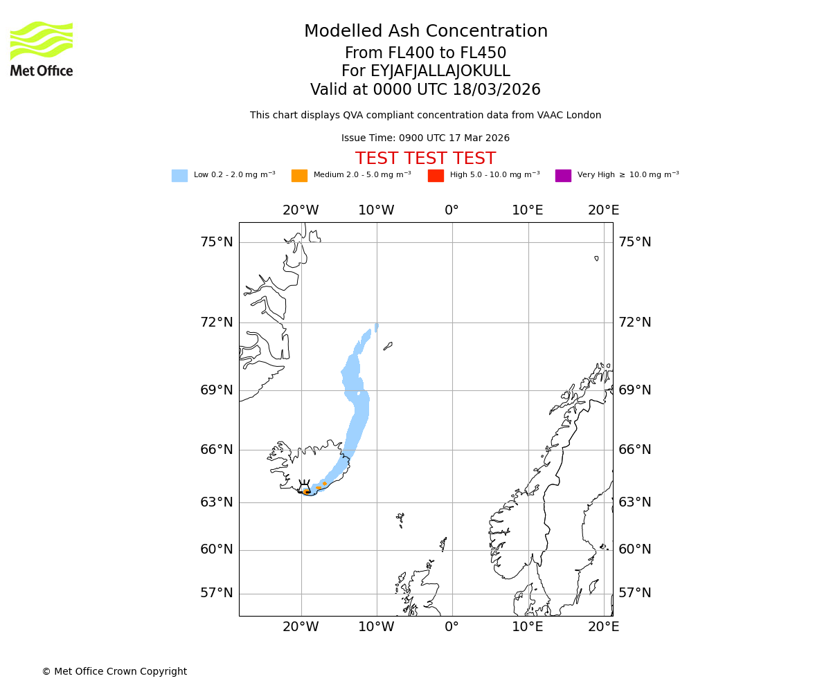 Modelled ash concentration from 400 to 450 for EYJAFJALLAJOKULL. Valid at 2100 UTC 17/03/2026