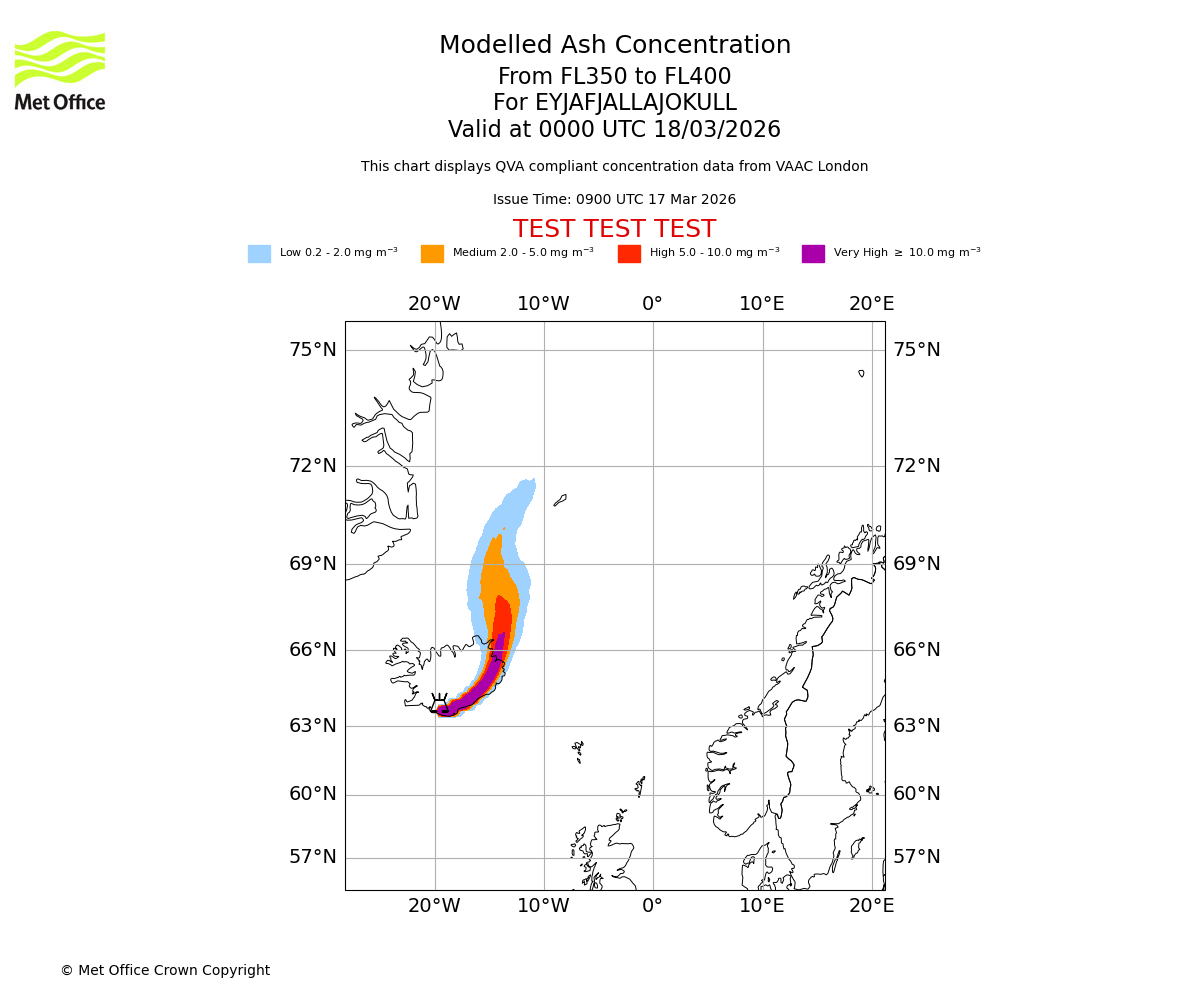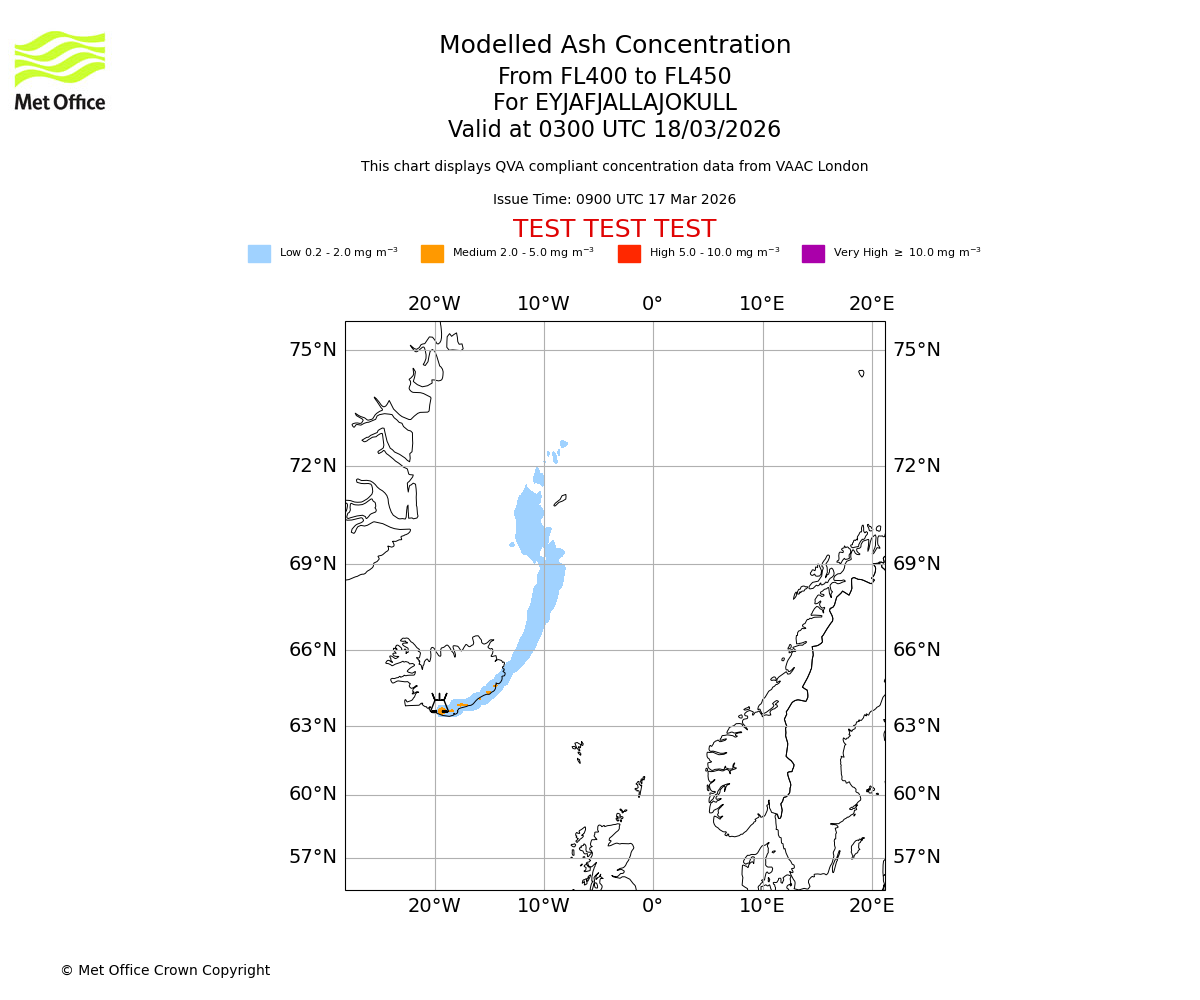 Modelled ash concentration from 400 to 450 for EYJAFJALLAJOKULL. Valid at 0000 UTC 18/03/2026