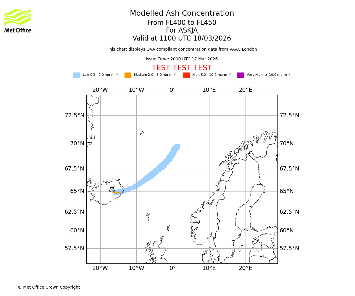 Modelled ash concentration from 400 to 450 for ASKJA. Valid at 0800 UTC 18/03/2026