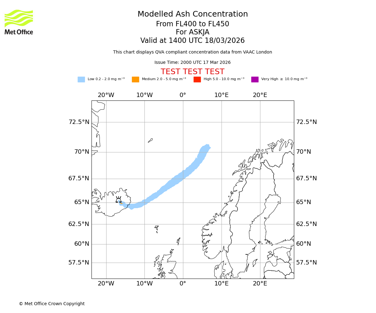 Modelled ash concentration from 400 to 450 for ASKJA. Valid at 1100 UTC 18/03/2026