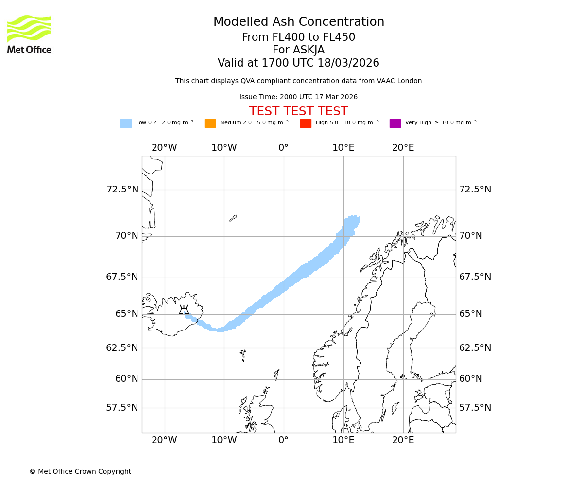 Modelled ash concentration from 400 to 450 for ASKJA. Valid at 1400 UTC 18/03/2026