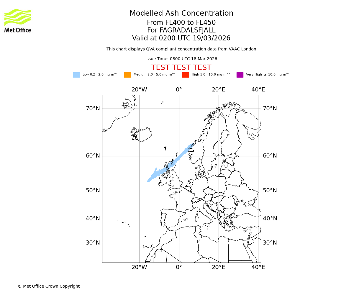 Modelled ash concentration from 400 to 450 for FAGRADALSFJALL. Valid at 2300 UTC 18/03/2026