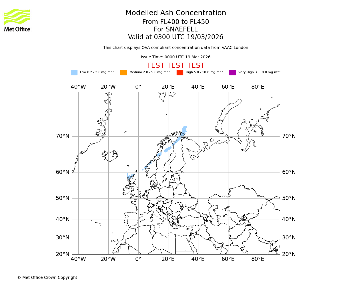 Modelled ash concentration from 400 to 450 for SNAEFELL. Valid at 0000 UTC 19/03/2026