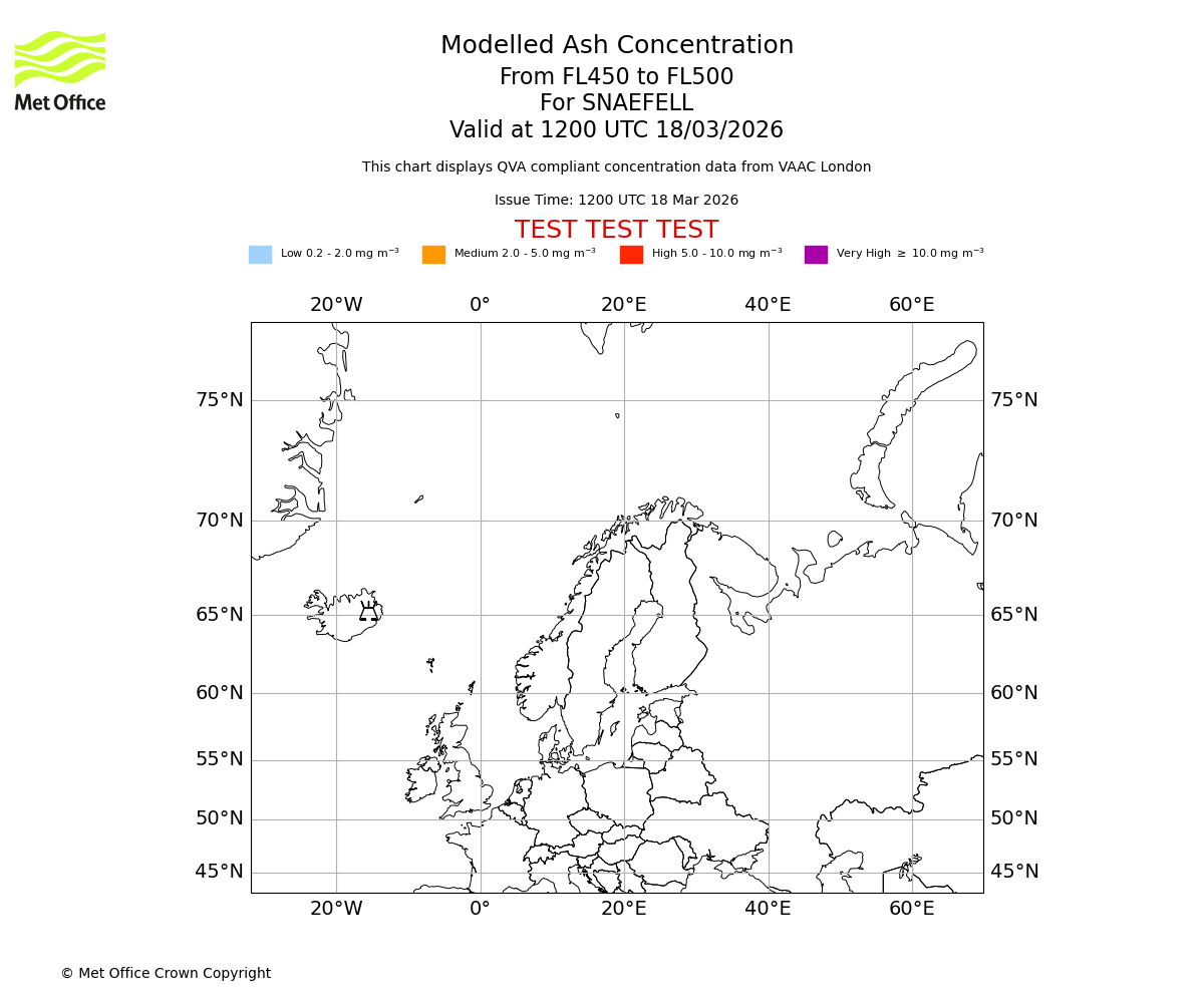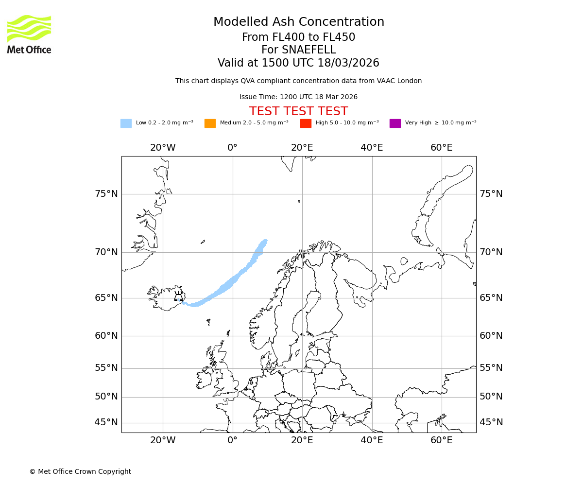 Modelled ash concentration from 400 to 450 for SNAEFELL. Valid at 1200 UTC 18/03/2026