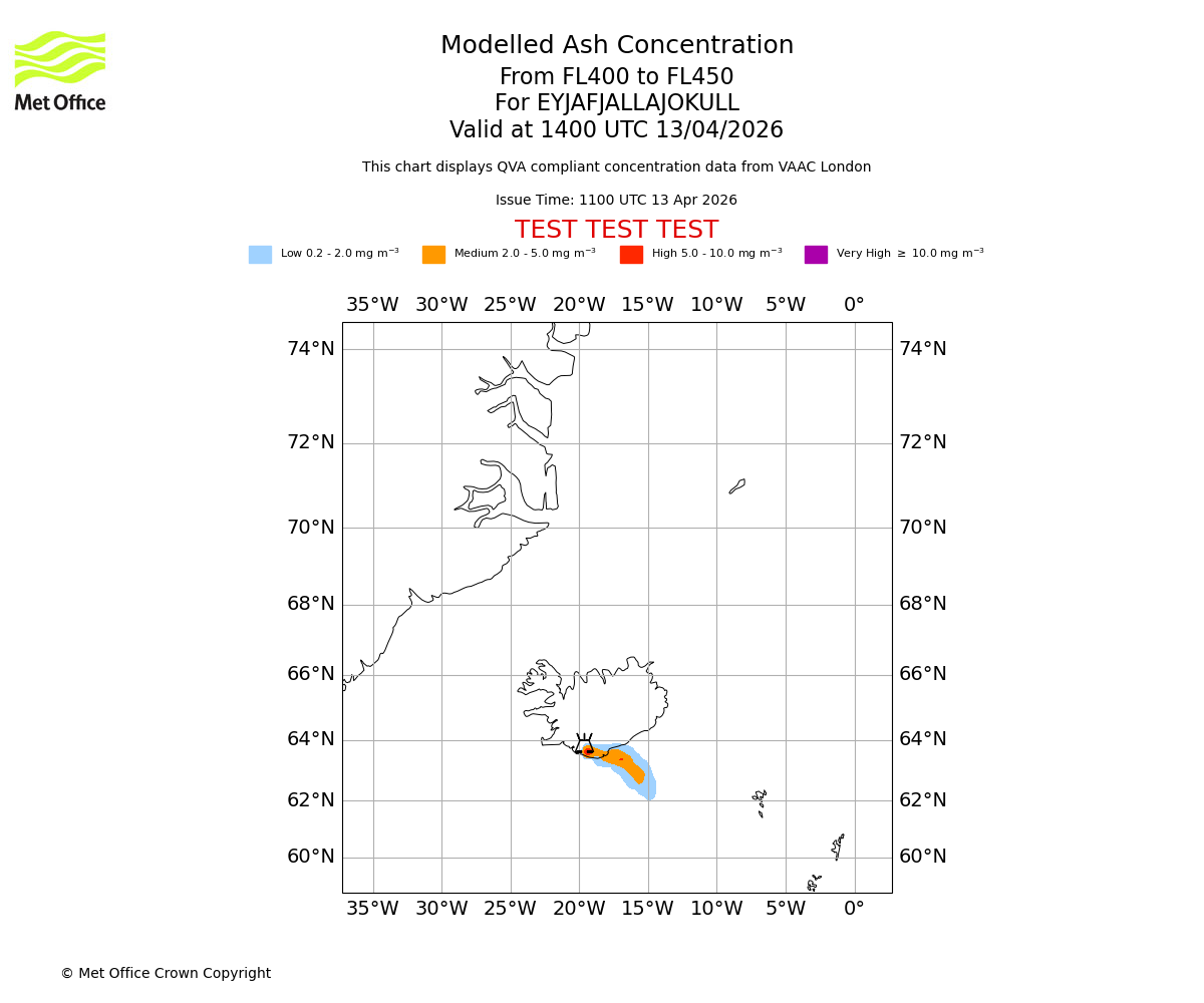 Modelled ash concentration from 400 to 450 for EYJAFJALLAJOKULL. Valid at 1100 UTC 13/04/2026
