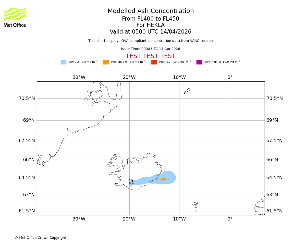 Modelled ash concentration from 400 to 450 for HEKLA. Valid at 0200 UTC 14/04/2026