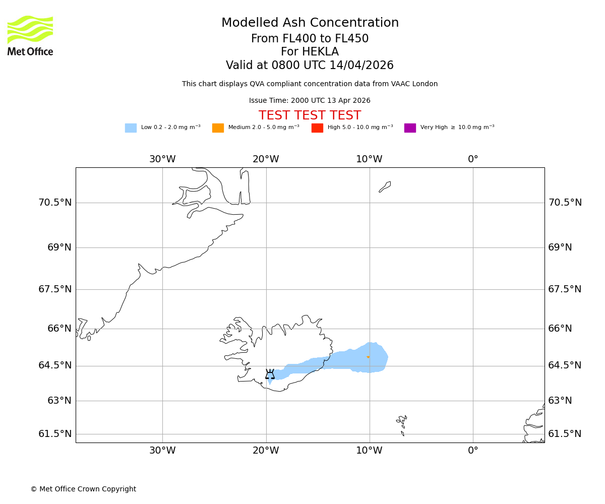 Modelled ash concentration from 400 to 450 for HEKLA. Valid at 0500 UTC 14/04/2026