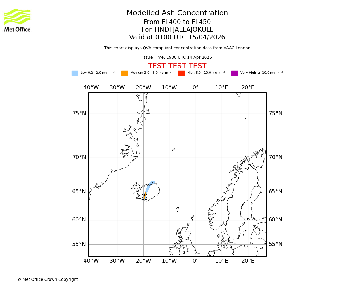 Modelled ash concentration from 400 to 450 for TINDFJALLAJOKULL. Valid at 2200 UTC 14/04/2026