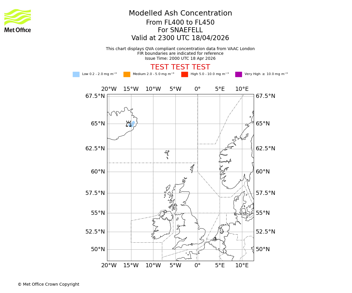 Modelled ash concentration from 400 to 450 for SNAEFELL. Valid at 2000 UTC 18/04/2026