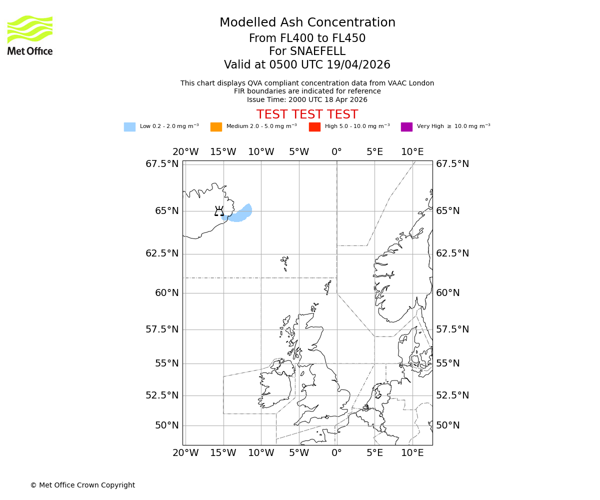 Modelled ash concentration from 400 to 450 for SNAEFELL. Valid at 0200 UTC 19/04/2026