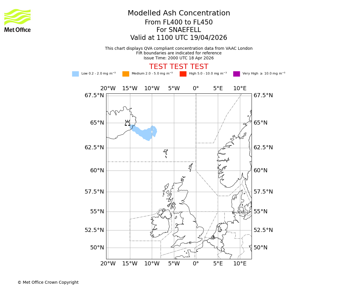 Modelled ash concentration from 400 to 450 for SNAEFELL. Valid at 0800 UTC 19/04/2026