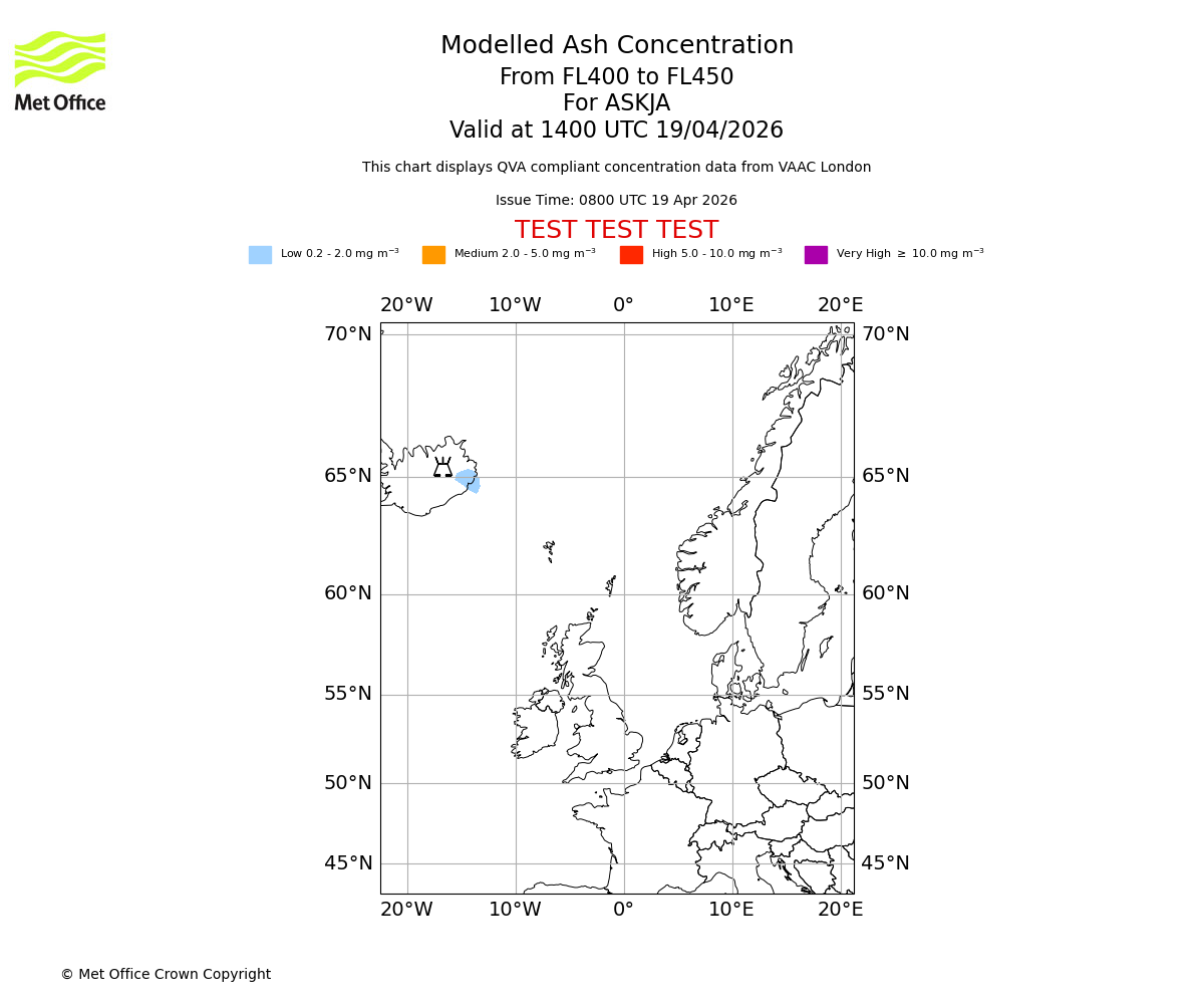 Modelled ash concentration from 400 to 450 for ASKJA. Valid at 1100 UTC 19/04/2026