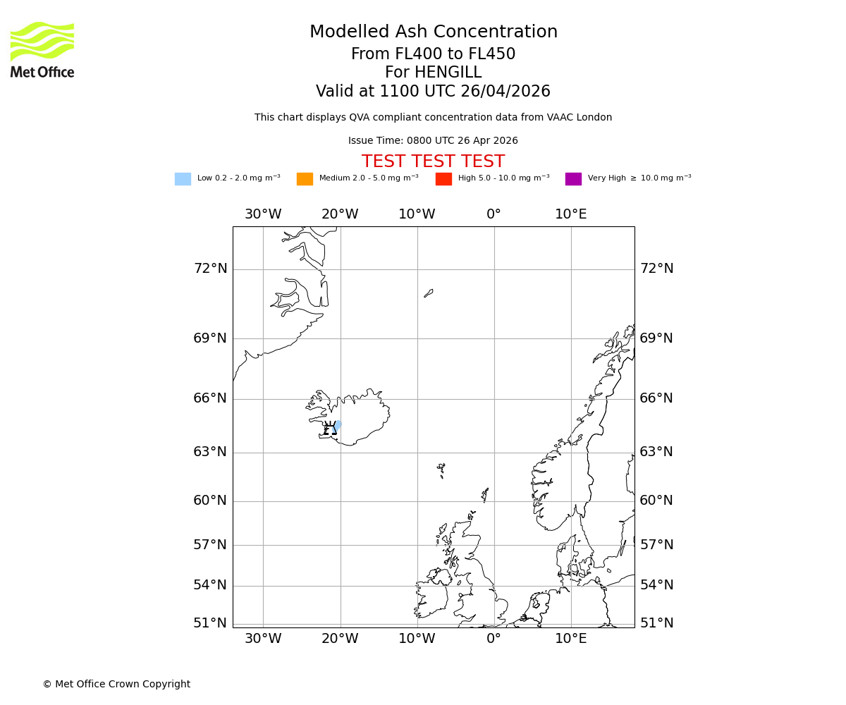 Modelled ash concentration from 400 to 450 for HENGILL. Valid at 0800 UTC 26/04/2026