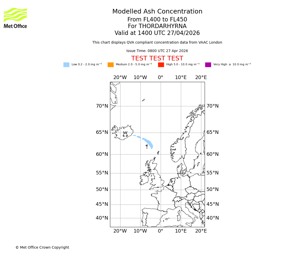 Modelled ash concentration from 400 to 450 for THORDARHYRNA. Valid at 1100 UTC 27/04/2026