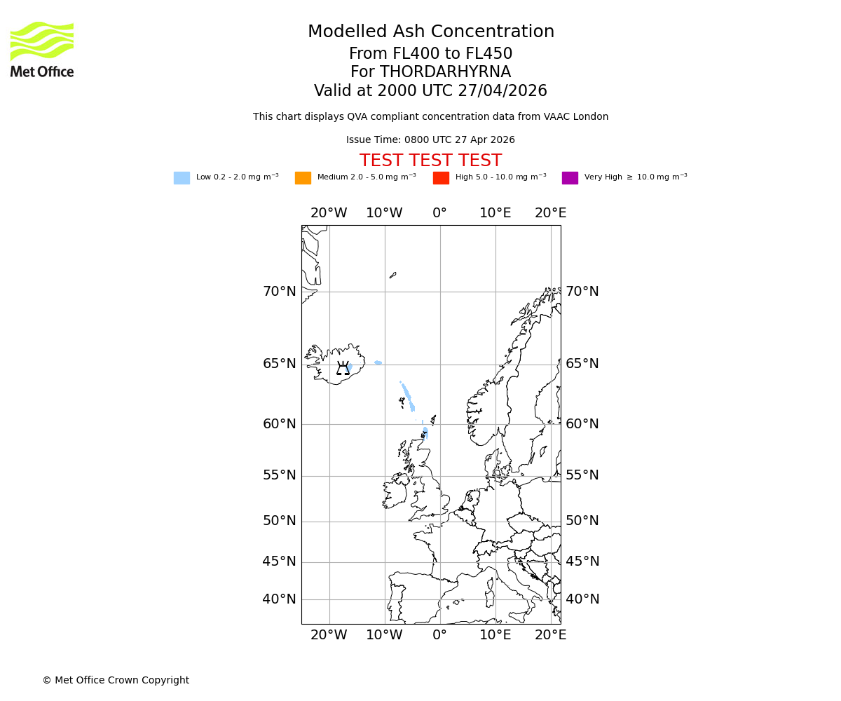 Modelled ash concentration from 400 to 450 for THORDARHYRNA. Valid at 1700 UTC 27/04/2026