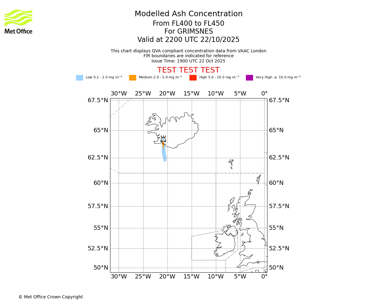 Modelled ash concentration from 400 to 450 for GRIMSNES. Valid at 1900 UTC 22/10/2025