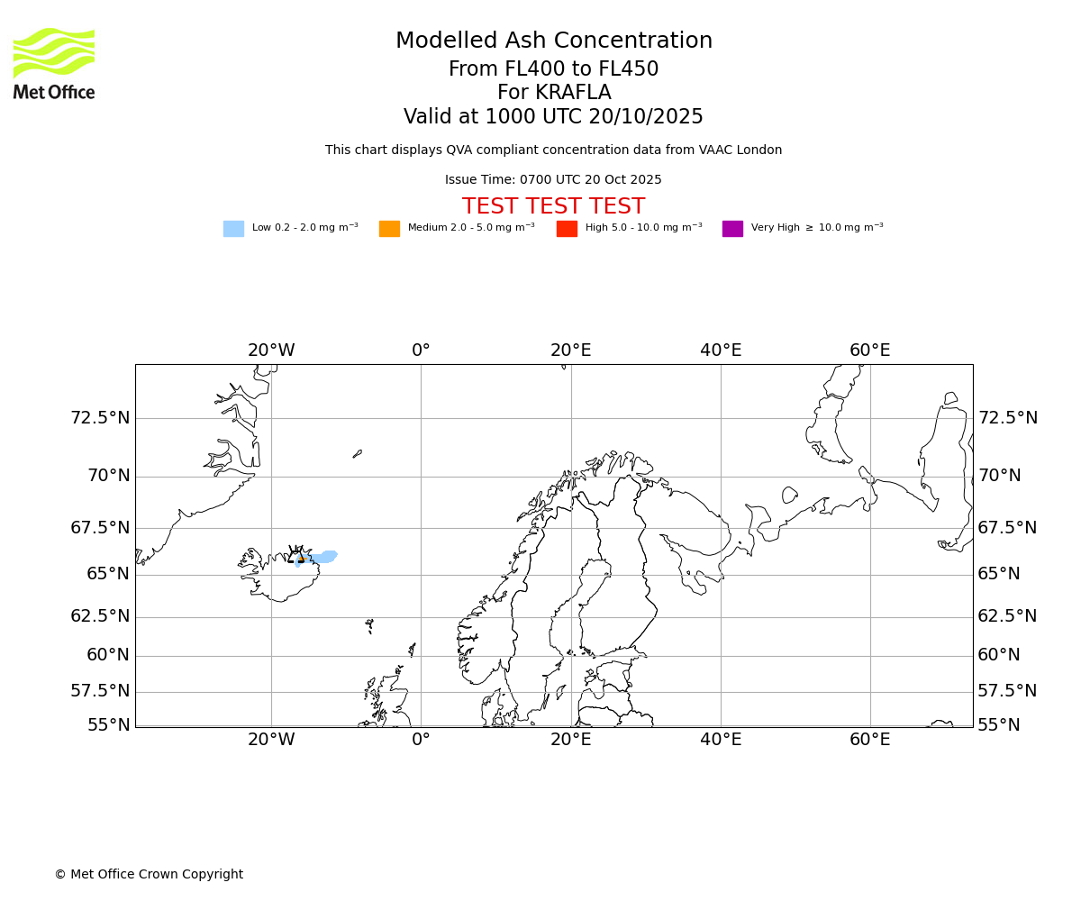 Modelled ash concentration from 400 to 450 for KRAFLA. Valid at 0700 UTC 20/10/2025