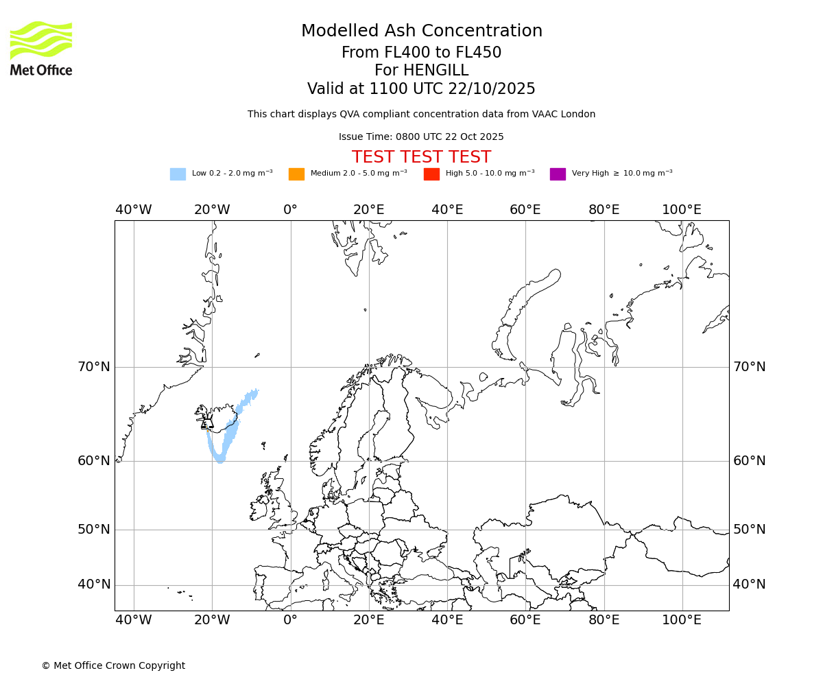 Modelled ash concentration from 400 to 450 for HENGILL. Valid at 0800 UTC 22/10/2025