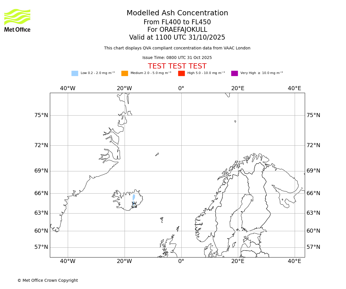 Modelled ash concentration from 400 to 450 for ORAEFAJOKULL. Valid at 0800 UTC 31/10/2025
