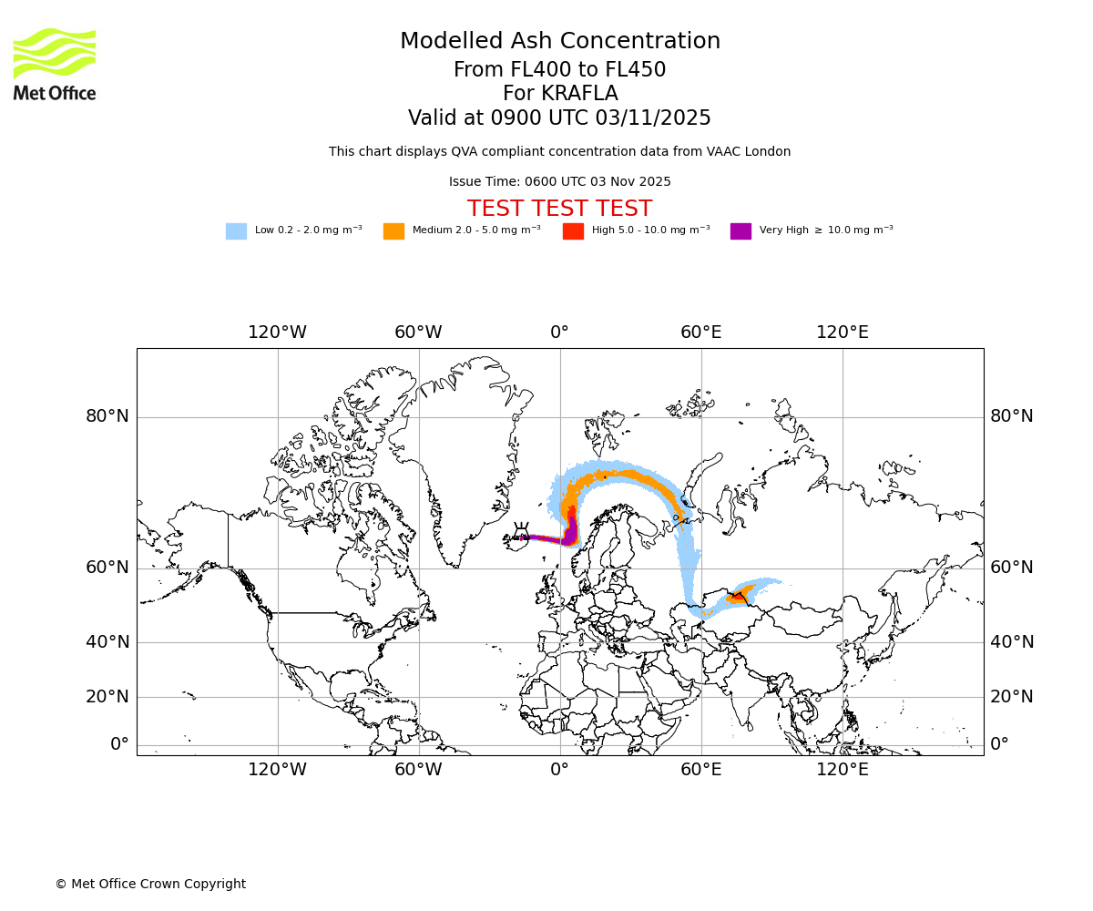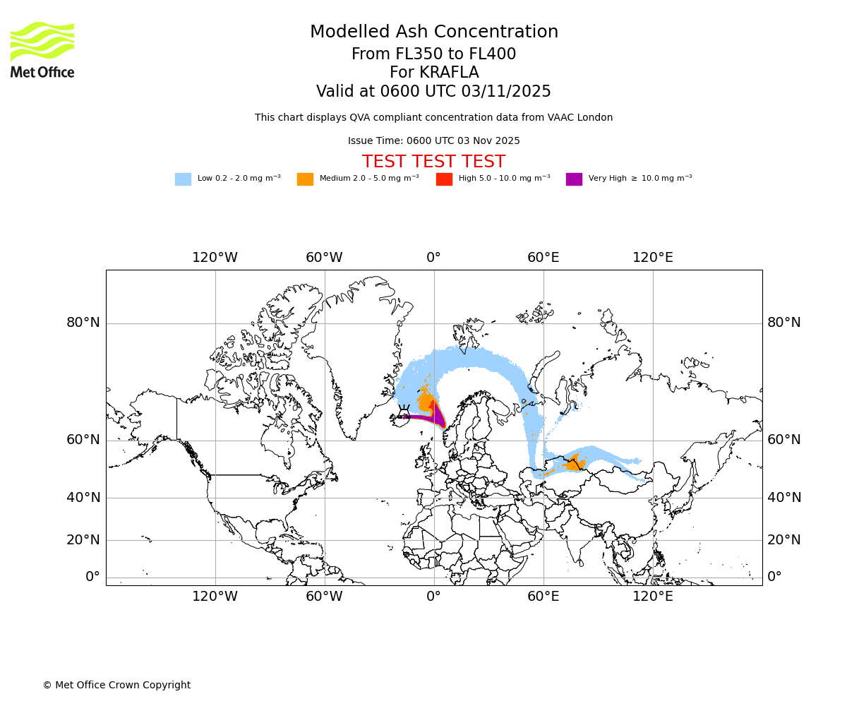 In accordance with ICAO Annex 3, Amendment 82 VAAC London will provide operational QVA forecasts from 27 November 2025 and these will be made available via a VAAC London QVA API information service. These charts are currently provided for test and evaluation purposes (not for operational use) until the introduction of the operational service.