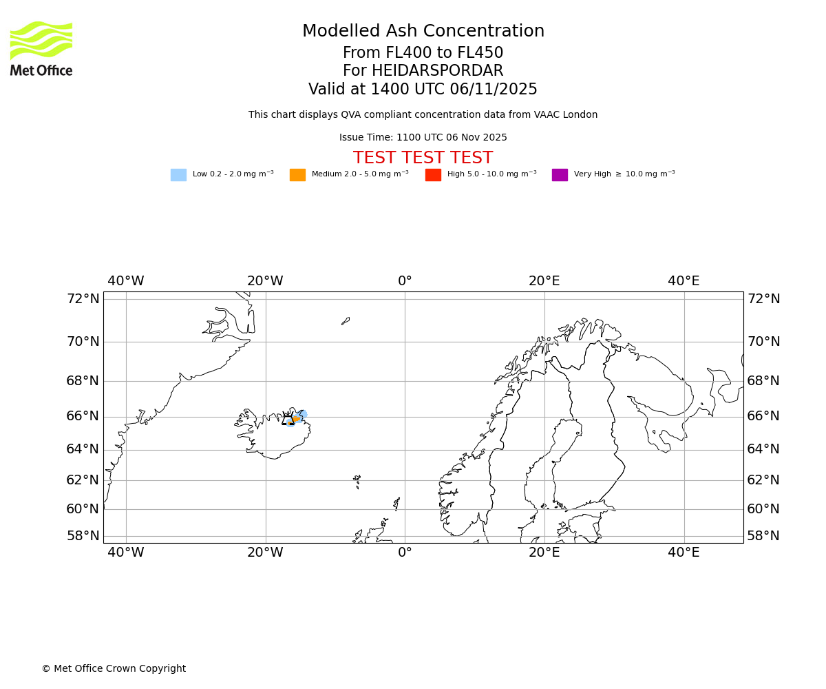 In accordance with ICAO Annex 3, Amendment 82 VAAC London will provide operational QVA forecasts from 27 November 2025 and these will be made available via a VAAC London QVA API information service. These charts are currently provided for test and evaluation purposes (not for operational use) until the introduction of the operational service.