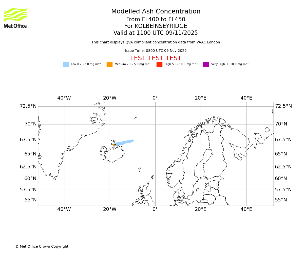 Modelled ash concentration from 400 to 450 for KOLBEINSEYRIDGE. Valid at 0800 UTC 09/11/2025