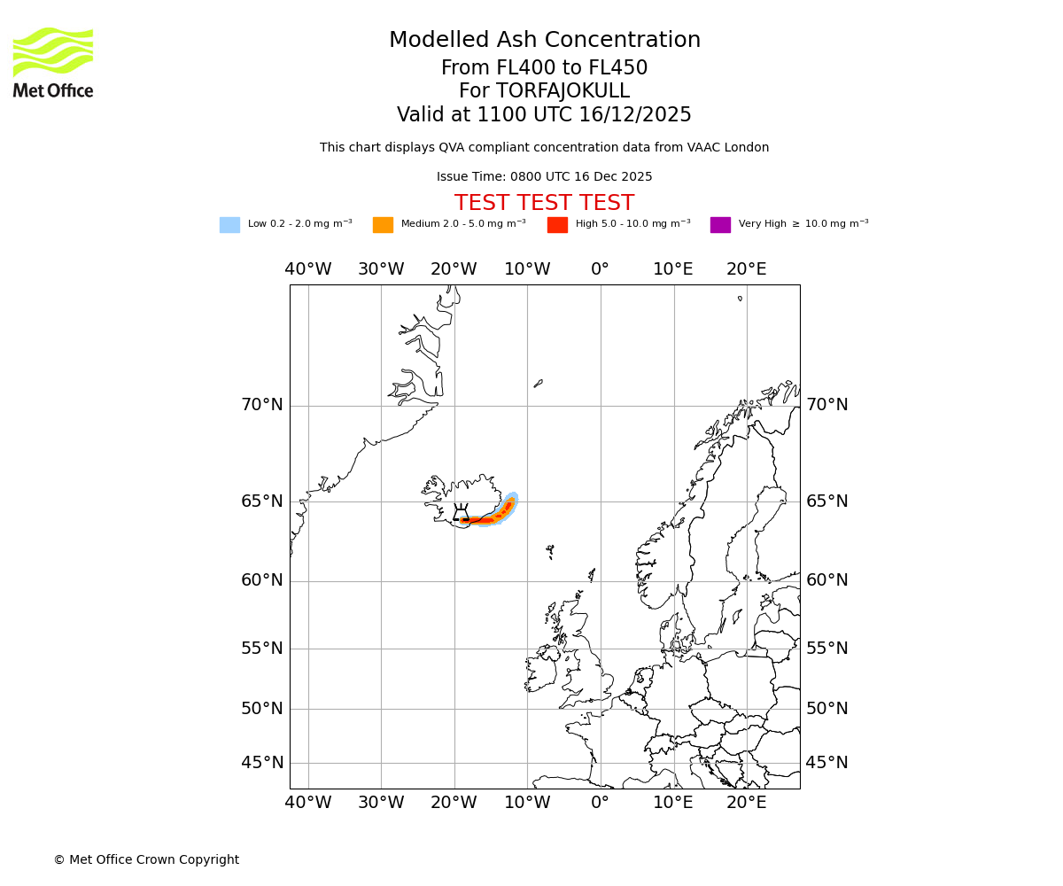 Modelled ash concentration from 400 to 450 for TORFAJOKULL. Valid at 0800 UTC 16/12/2025