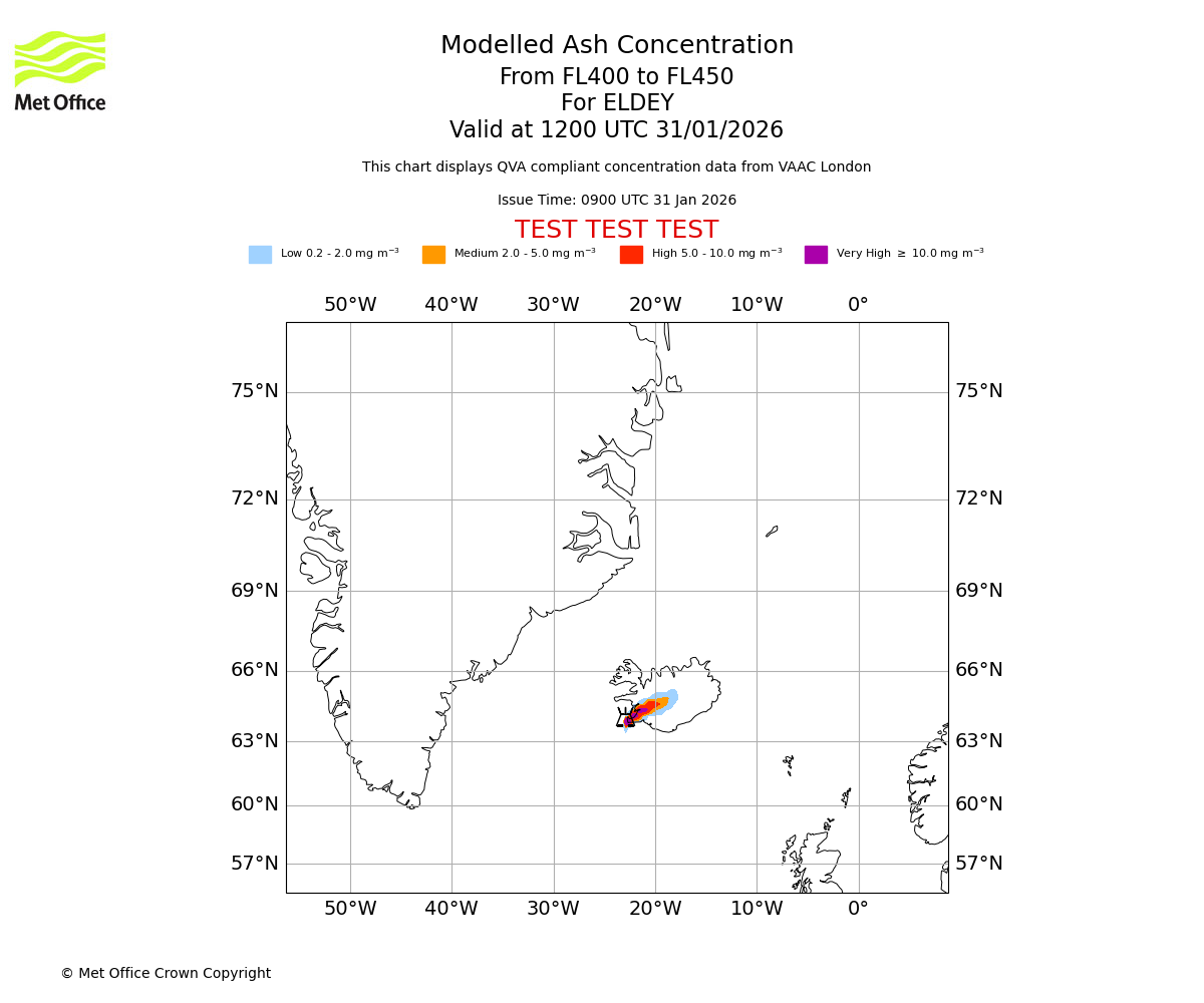 Modelled ash concentration from 400 to 450 for ELDEY. Valid at 0900 UTC 31/01/2026