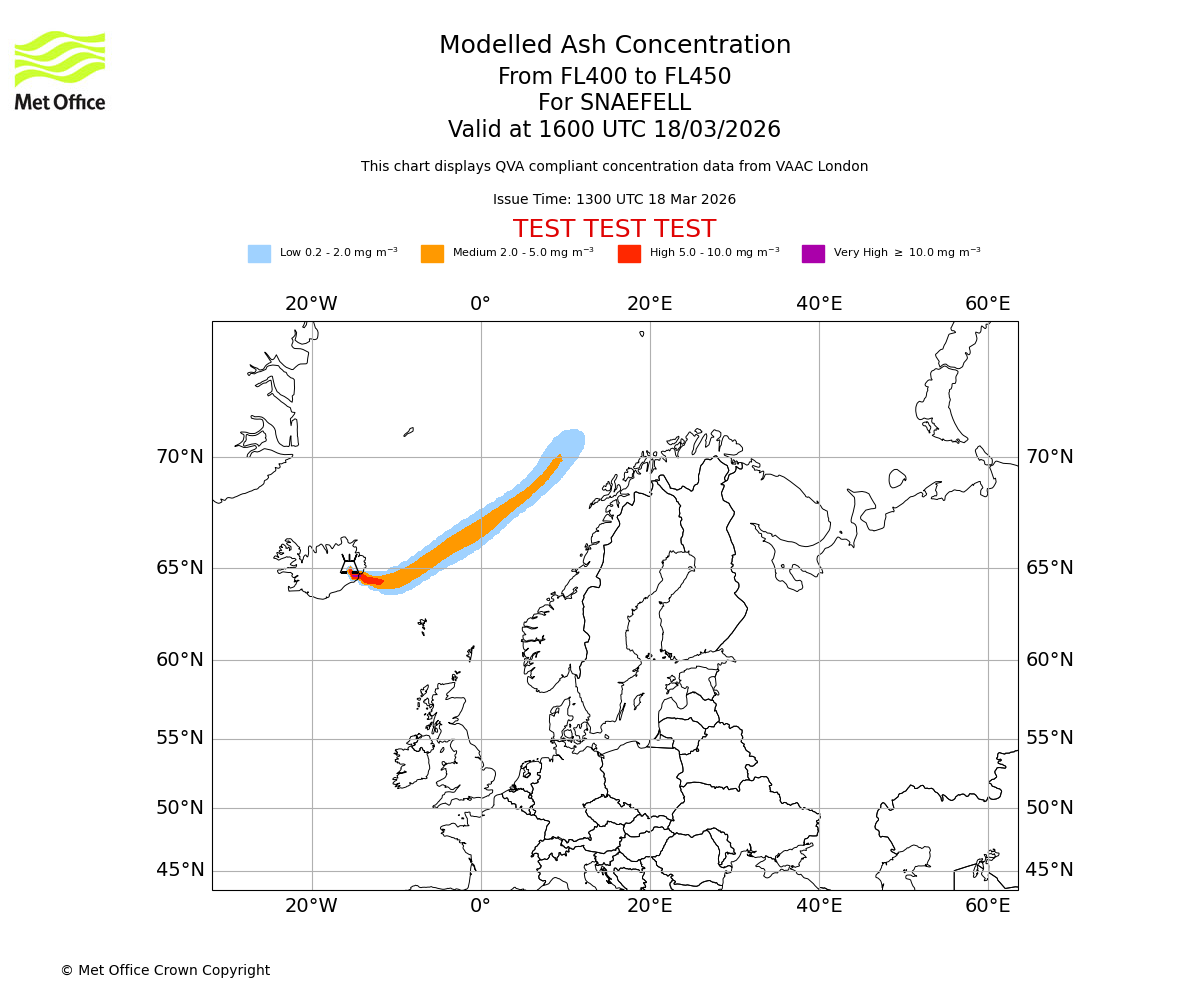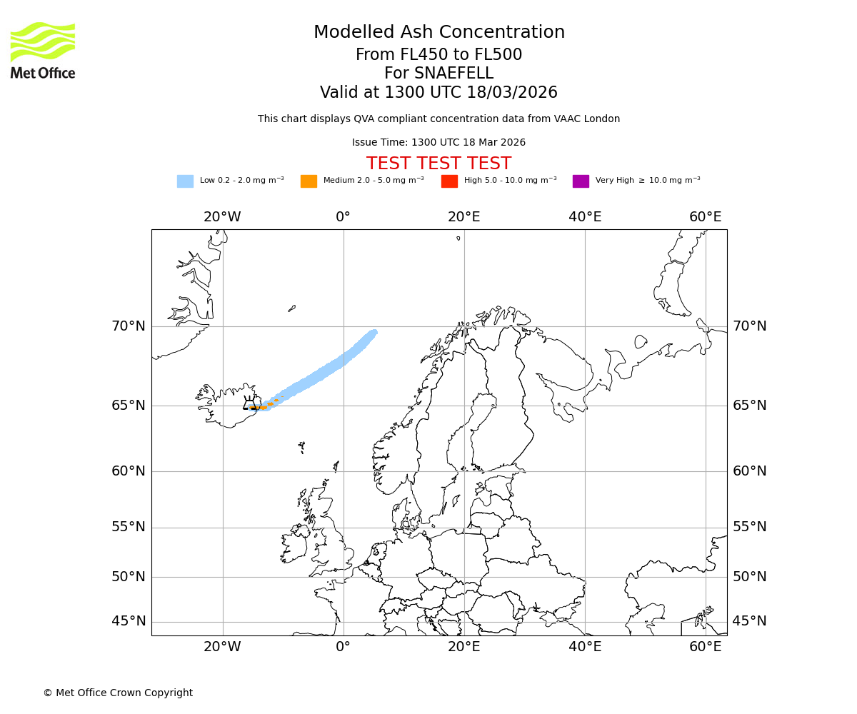 Modelled ash concentration from 400 to 450 for SNAEFELL. Valid at 1300 UTC 18/03/2026