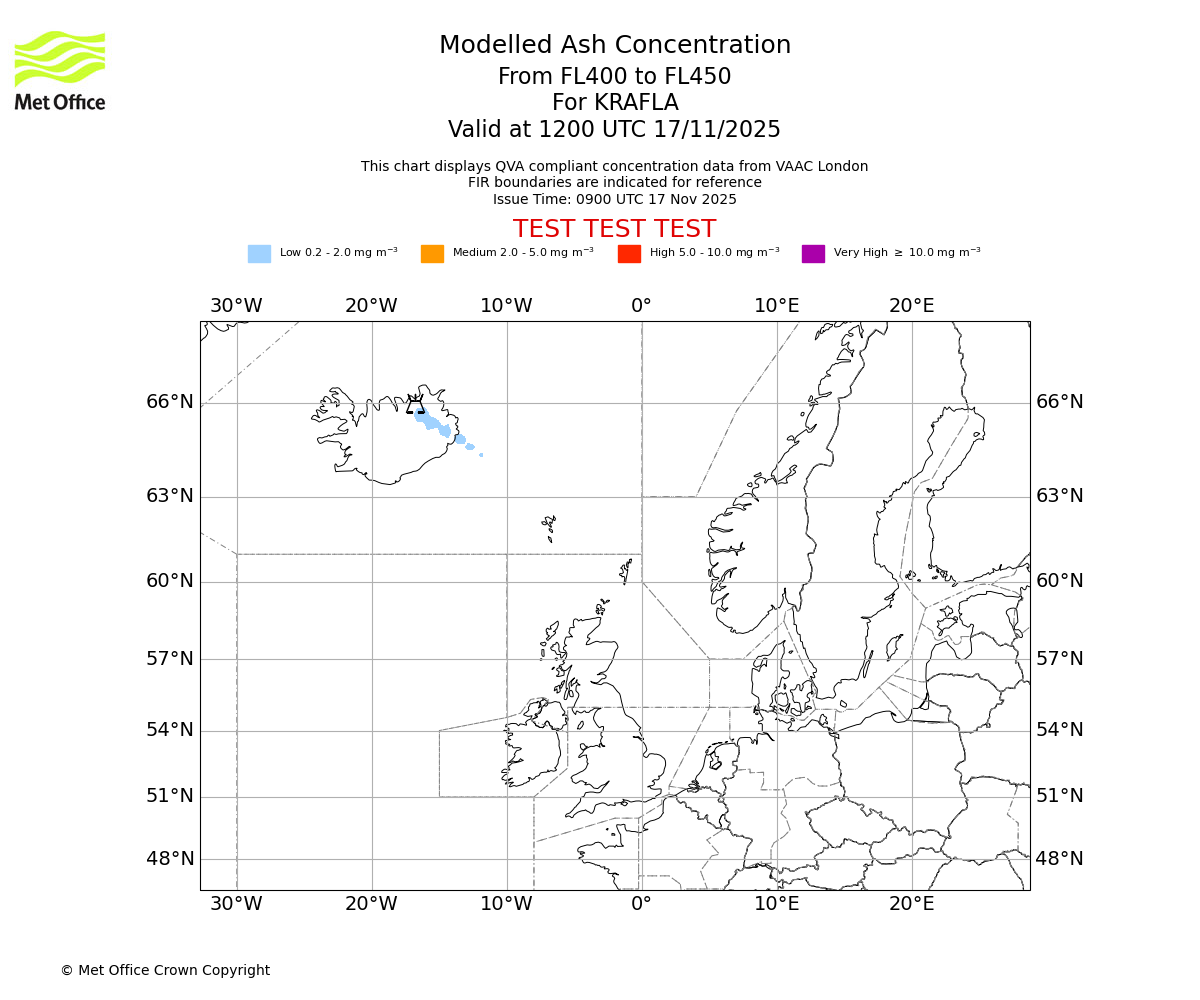 Modelled ash concentration from 400 to 450 for KRAFLA. Valid at 0900 UTC 17/11/2025
