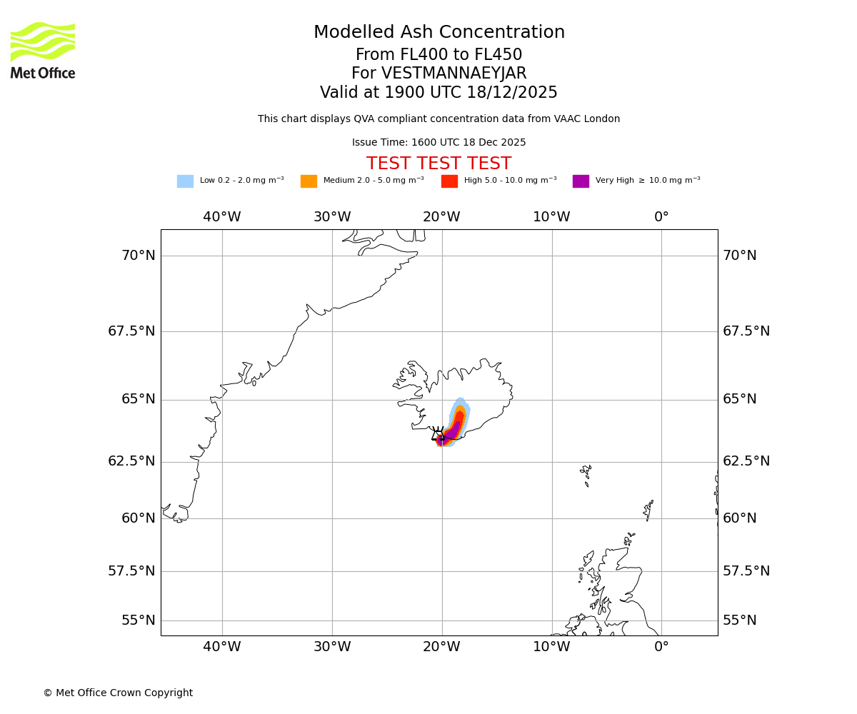 Modelled ash concentration from 400 to 450 for VESTMANNAEYJAR. Valid at 1600 UTC 18/12/2025