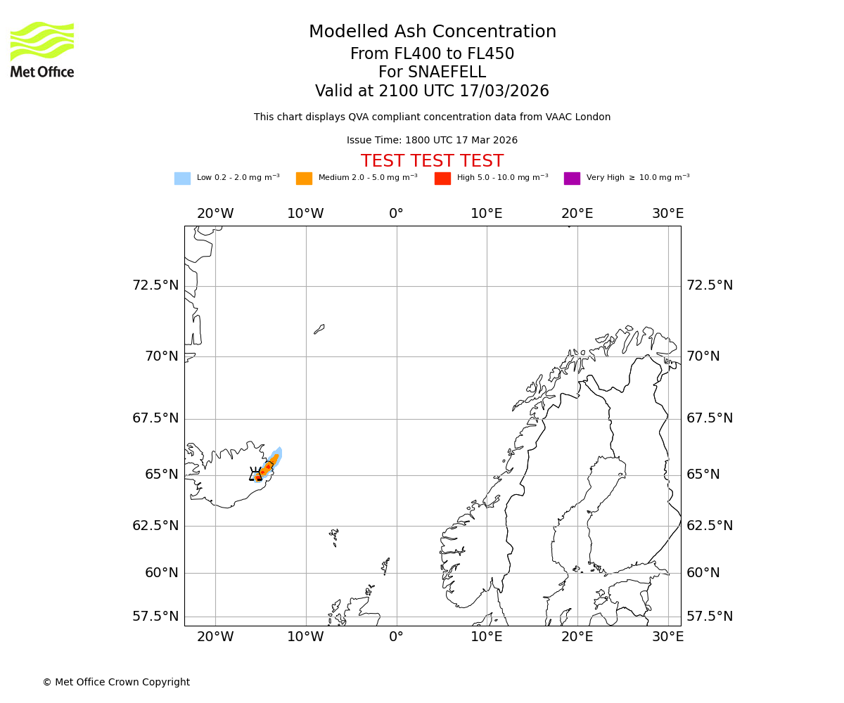 Modelled ash concentration from 400 to 450 for SNAEFELL. Valid at 1800 UTC 17/03/2026