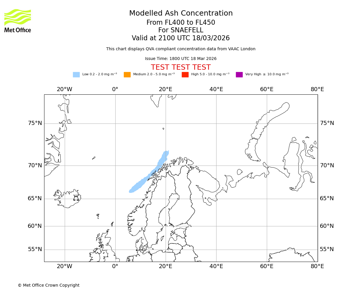 Modelled ash concentration from 400 to 450 for SNAEFELL. Valid at 1800 UTC 18/03/2026