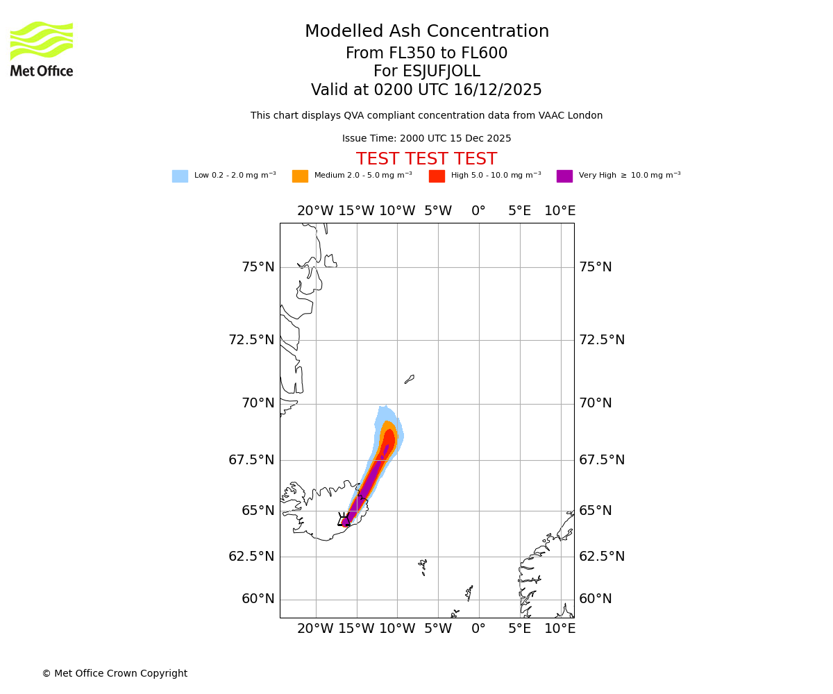 Modelled ash concentration from 350 to 600 for ESJUFJOLL. Valid at 2000 UTC 15/12/2025