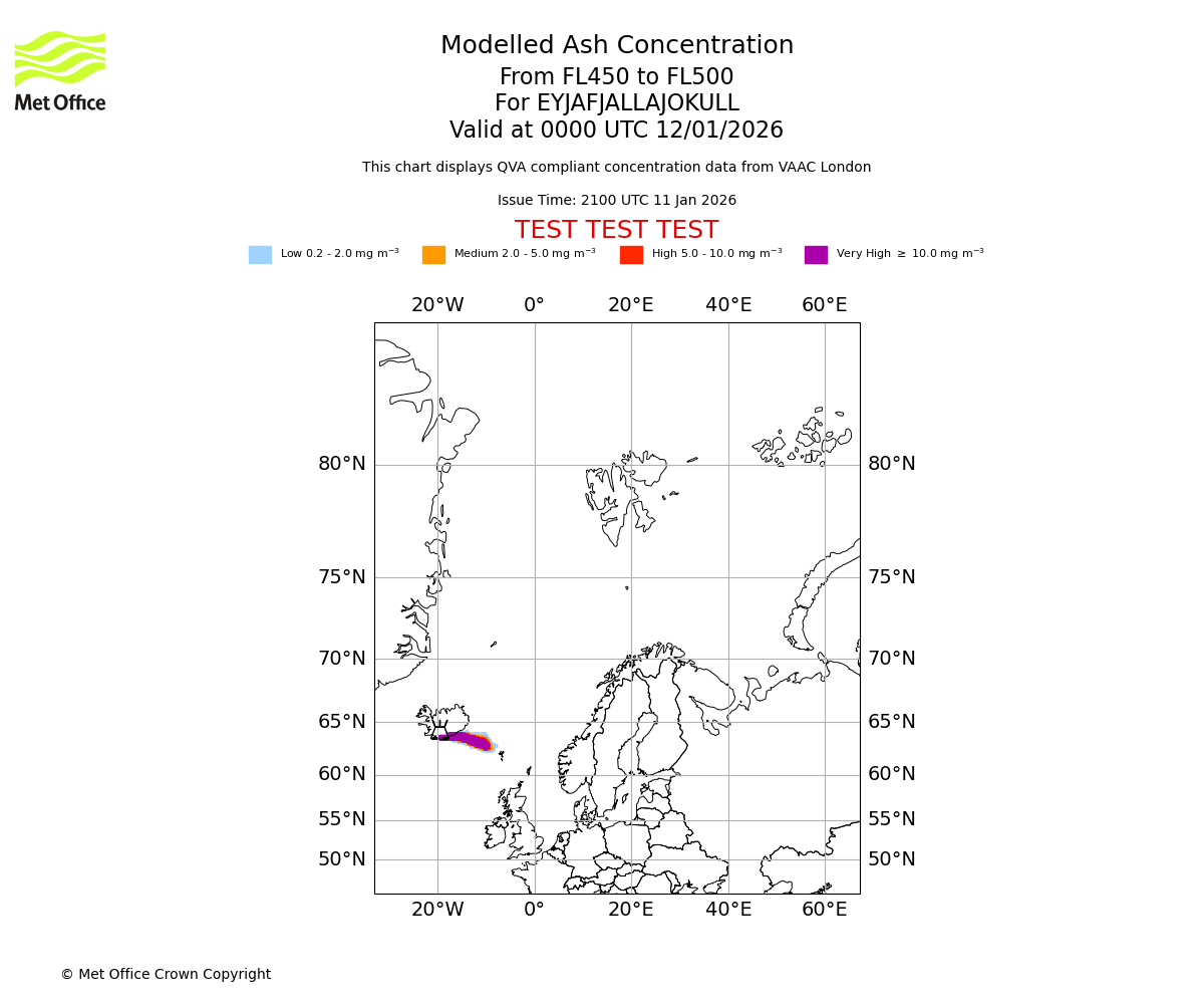 Modelled ash concentration from 450 to 500 for EYJAFJALLAJOKULL. Valid at 2100 UTC 11/01/2026