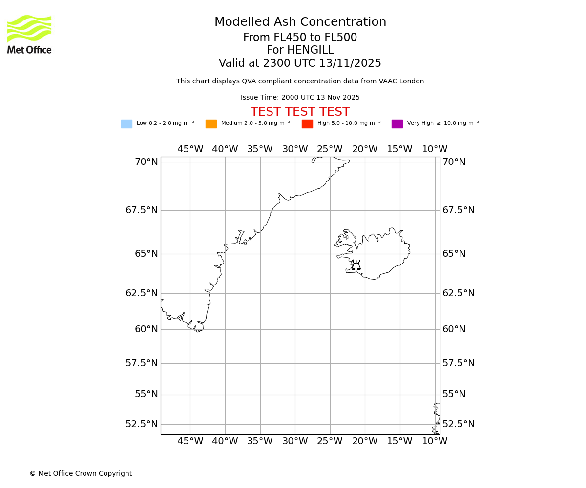 Modelled ash concentration from 450 to 500 for HENGILL. Valid at 2000 UTC 13/11/2025