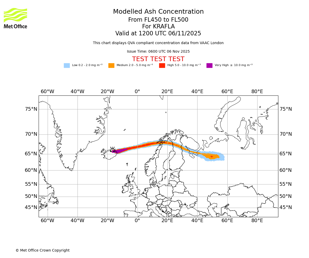 In accordance with ICAO Annex 3, Amendment 82 VAAC London will provide operational QVA forecasts from 27 November 2025 and these will be made available via a VAAC London QVA API information service. These charts are currently provided for test and evaluation purposes (not for operational use) until the introduction of the operational service.