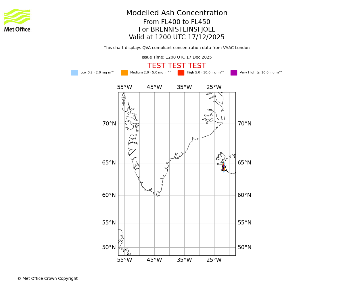 Modelled ash concentration from 450 to 500 for BRENNISTEINSFJOLL. Valid at 1200 UTC 17/12/2025