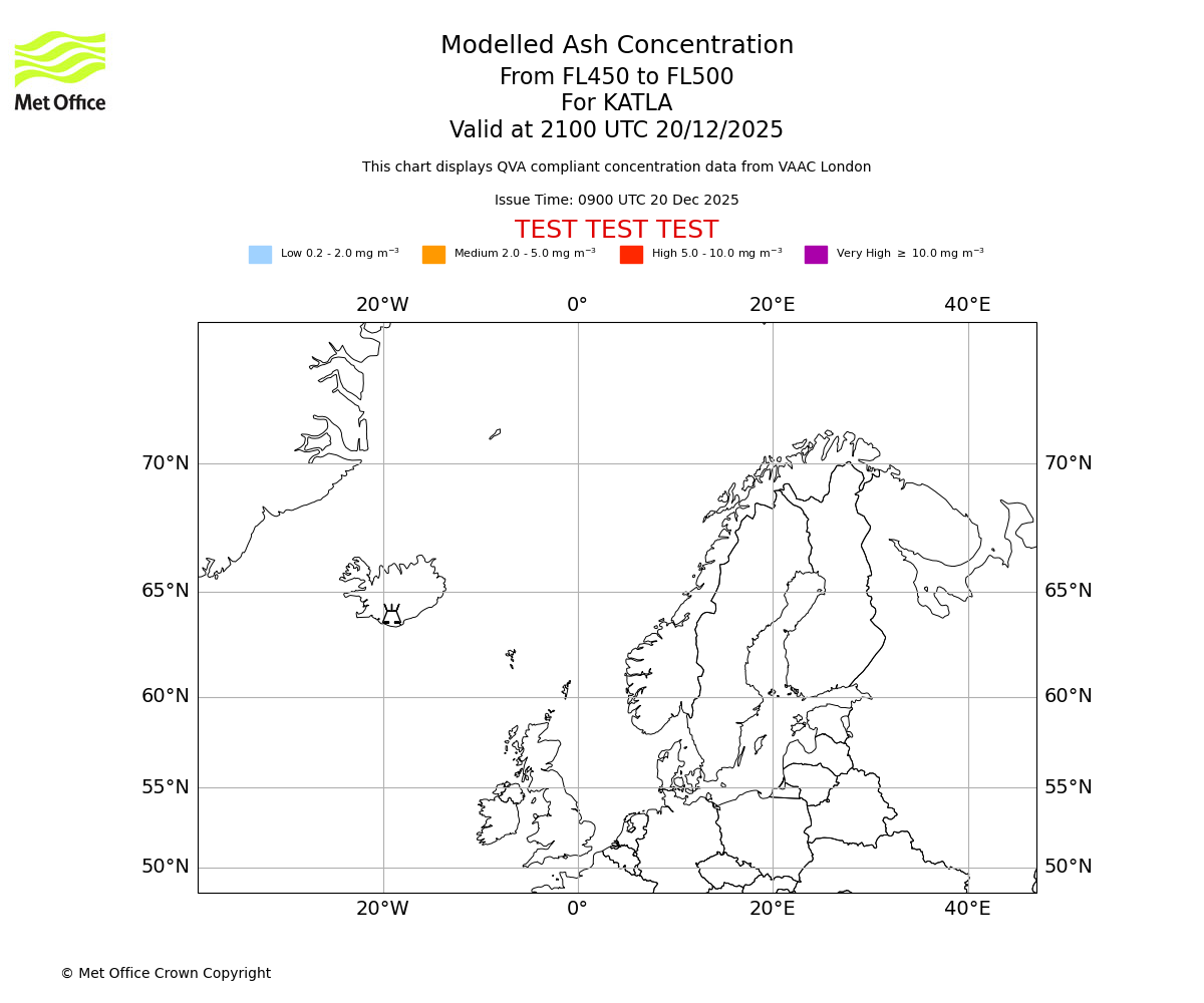 Modelled ash concentration from 450 to 500 for KATLA. Valid at 1800 UTC 20/12/2025