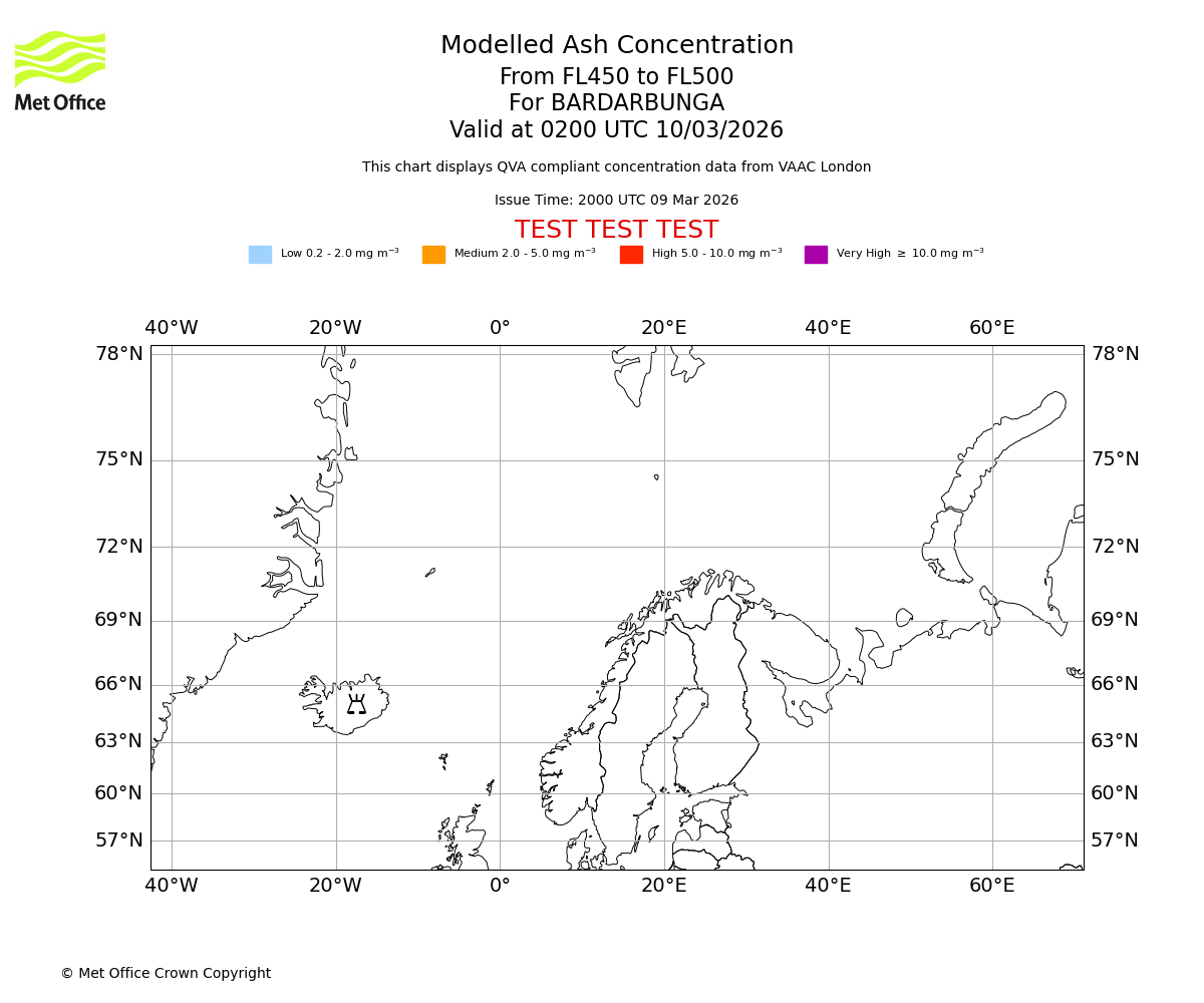Modelled ash concentration from 450 to 500 for BARDARBUNGA. Valid at 2300 UTC 09/03/2026
