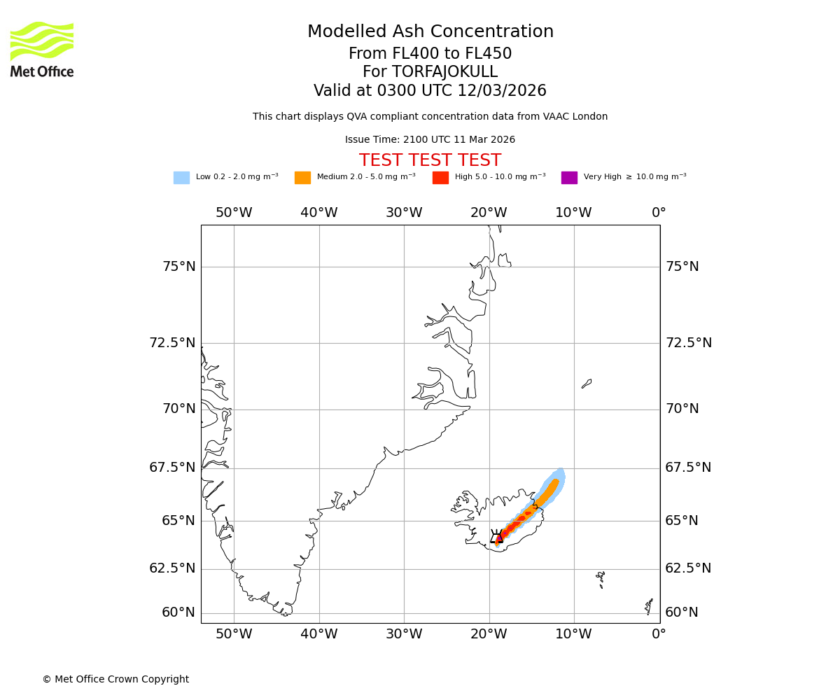 Modelled ash concentration from 450 to 500 for TORFAJOKULL. Valid at 0300 UTC 12/03/2026