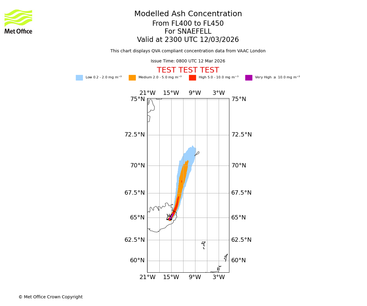 Modelled ash concentration from 450 to 500 for SNAEFELL. Valid at 2300 UTC 12/03/2026