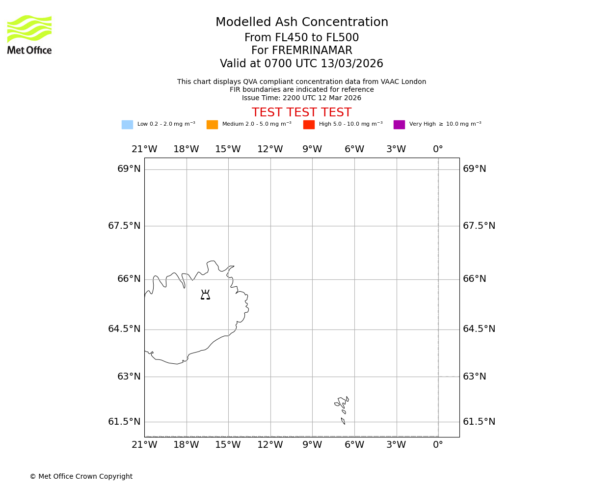 Modelled ash concentration from 450 to 500 for FREMRINAMAR. Valid at 0400 UTC 13/03/2026