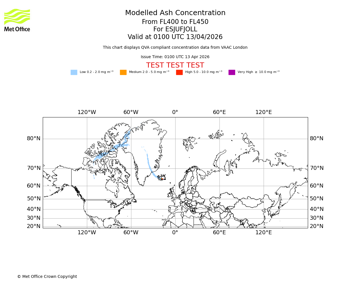 Modelled ash concentration from 450 to 500 for ESJUFJOLL. Valid at 0100 UTC 13/04/2026