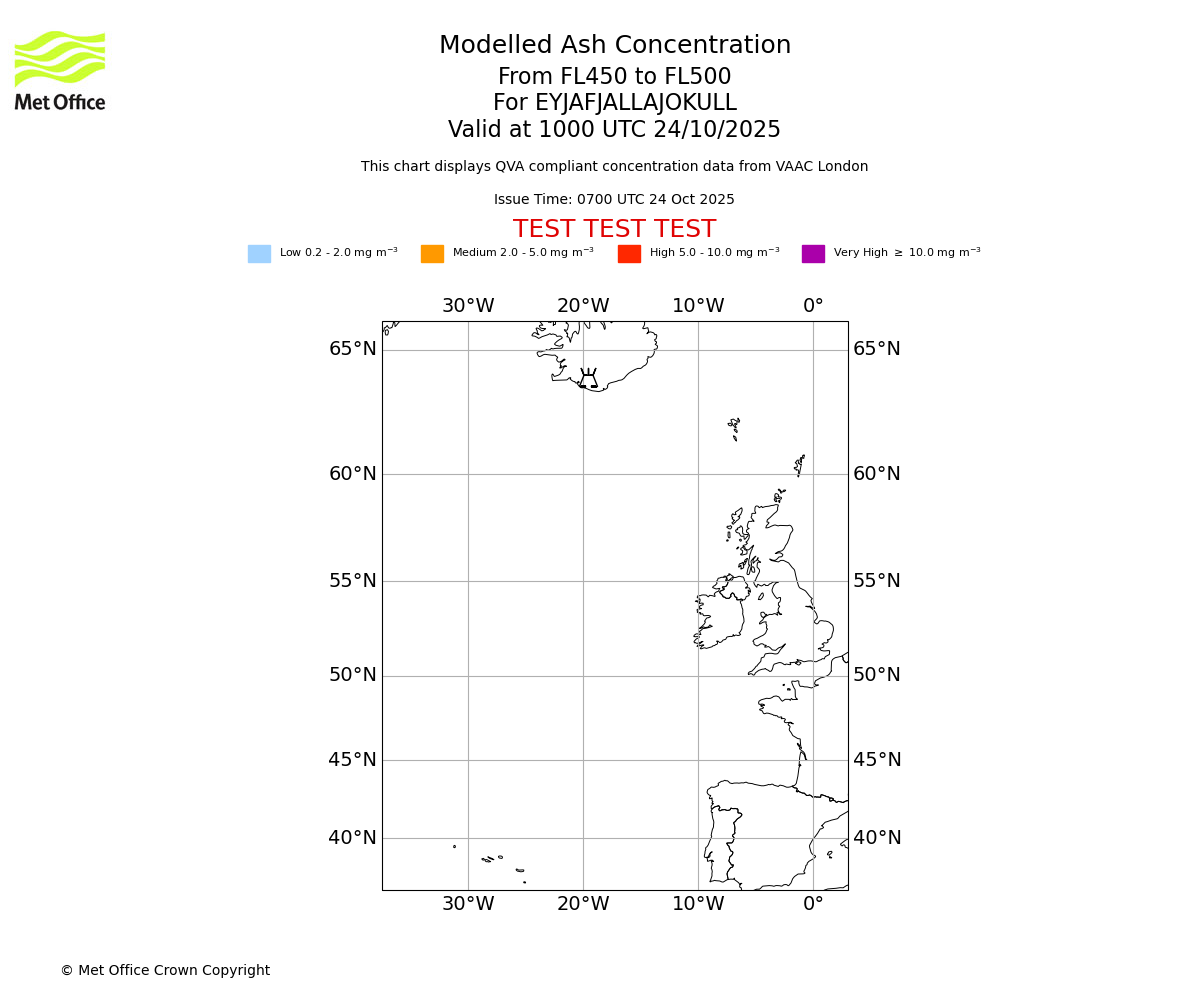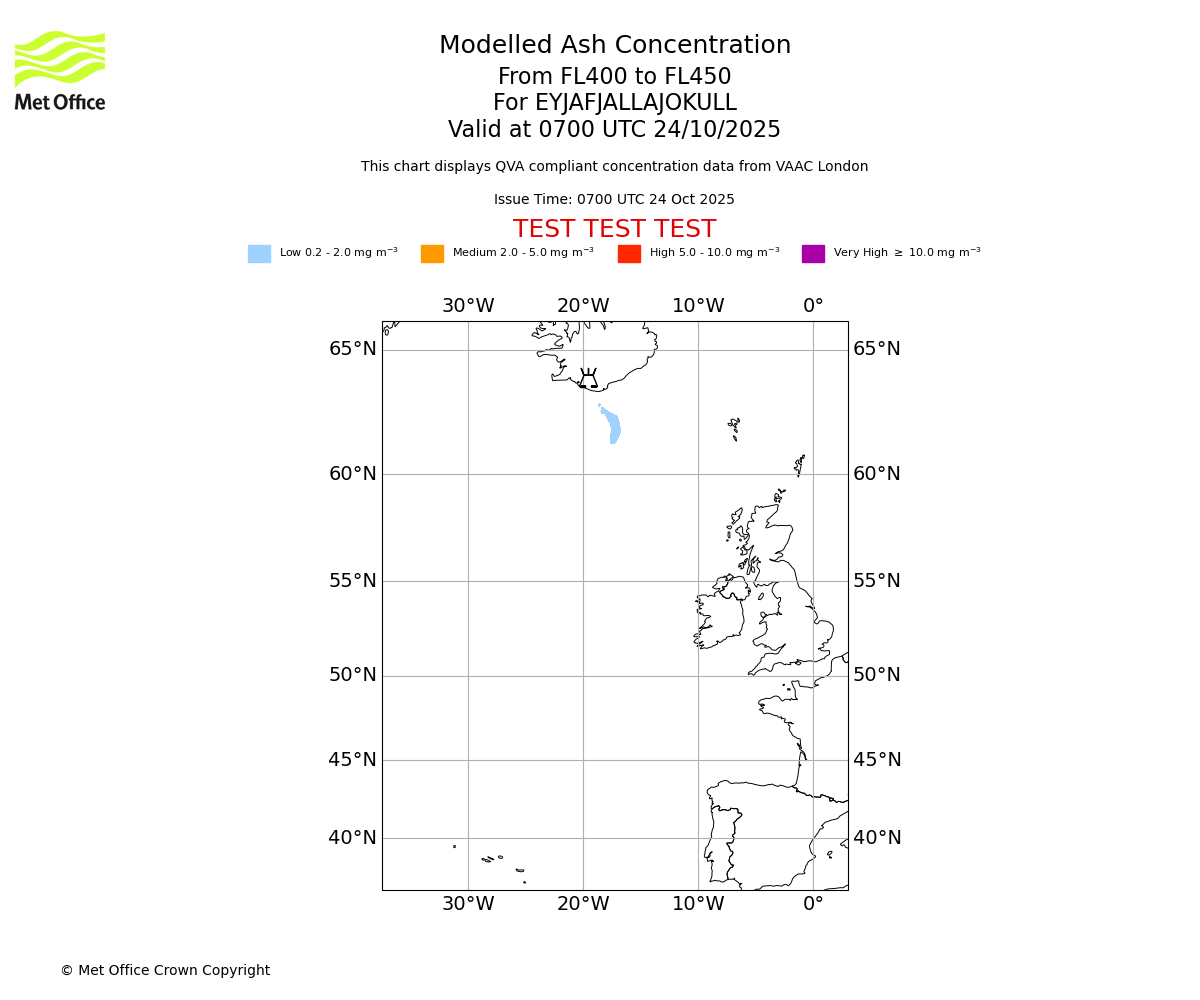Modelled ash concentration from 450 to 500 for EYJAFJALLAJOKULL. Valid at 0700 UTC 24/10/2025