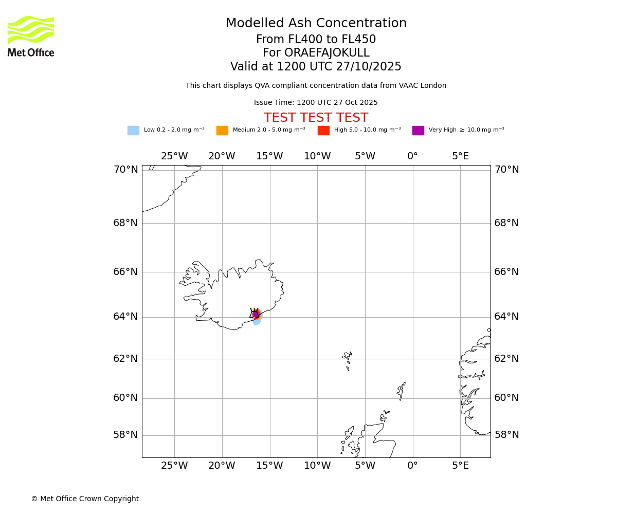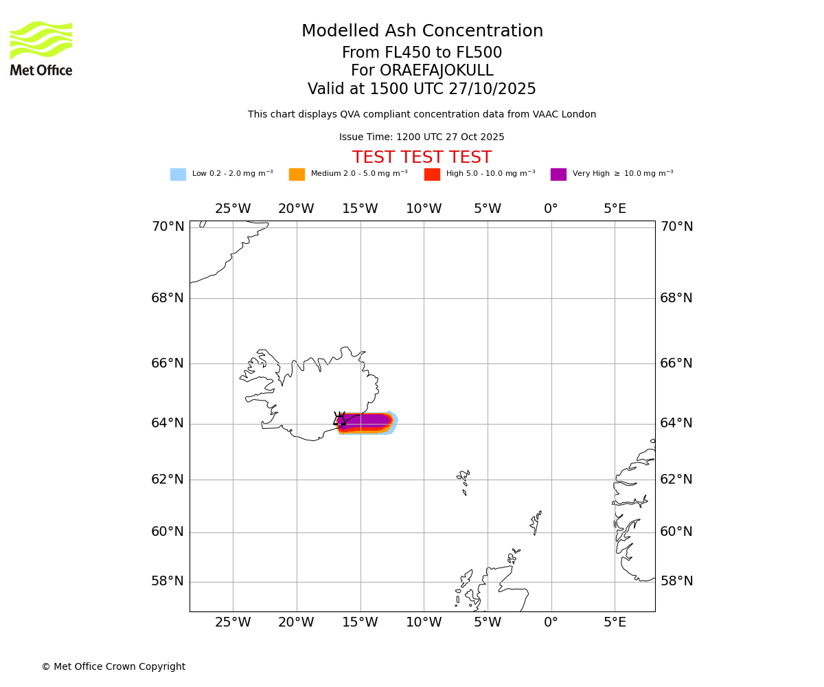 Modelled ash concentration from 450 to 500 for ORAEFAJOKULL. Valid at 1200 UTC 27/10/2025