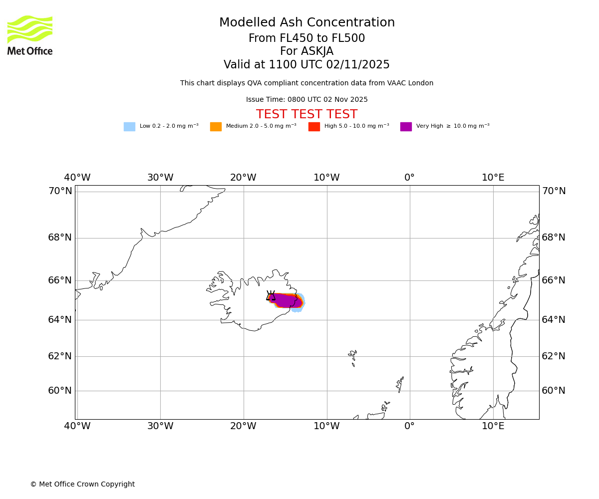 Modelled ash concentration from 450 to 500 for ASKJA. Valid at 0800 UTC 02/11/2025
