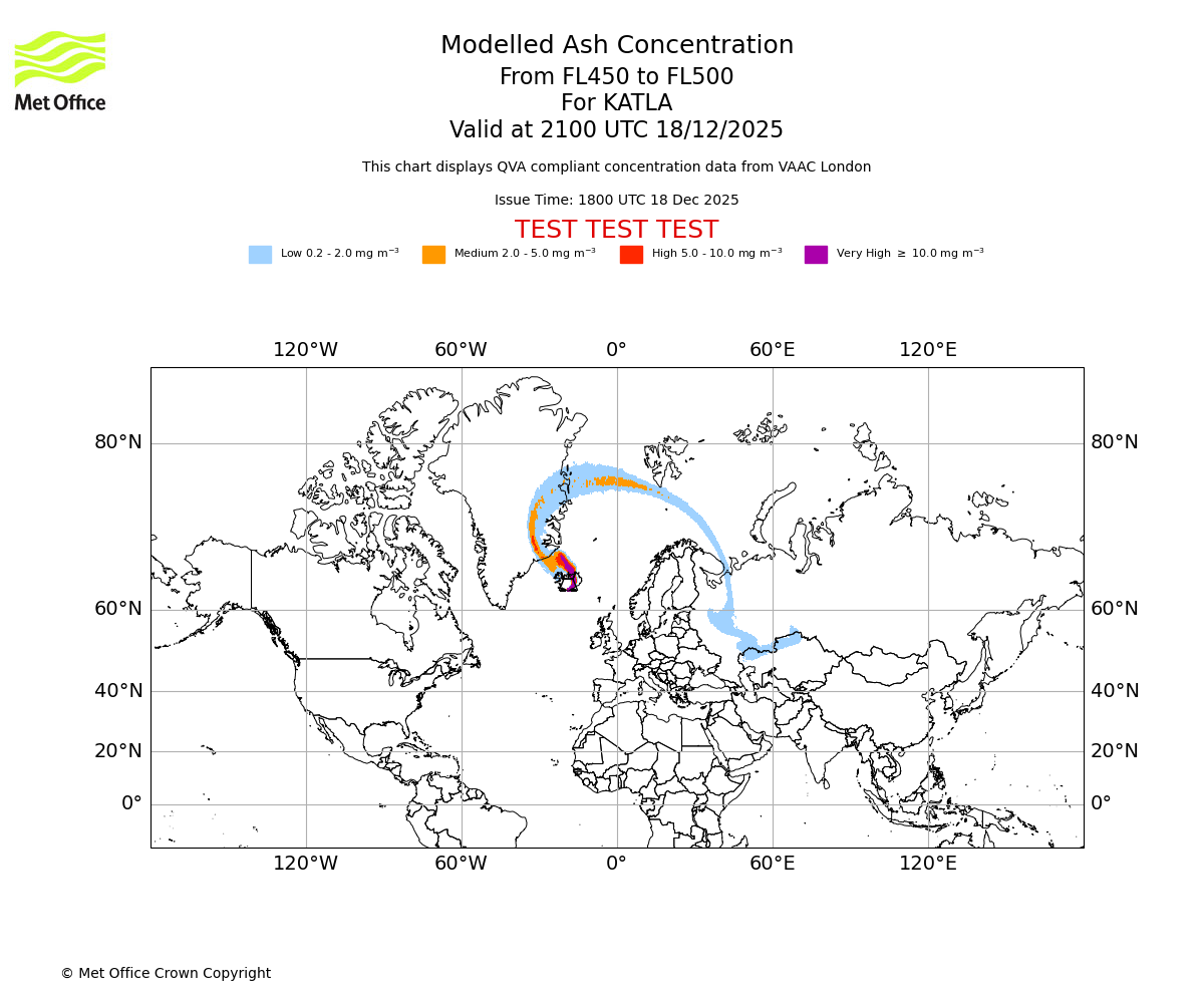 Modelled ash concentration from 450 to 500 for KATLA. Valid at 1800 UTC 18/12/2025