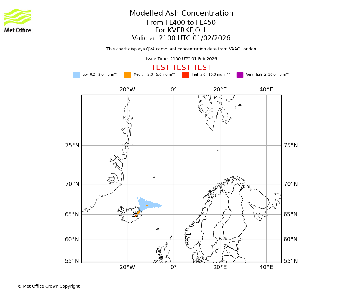 Modelled ash concentration from 450 to 500 for KVERKFJOLL. Valid at 2100 UTC 01/02/2026