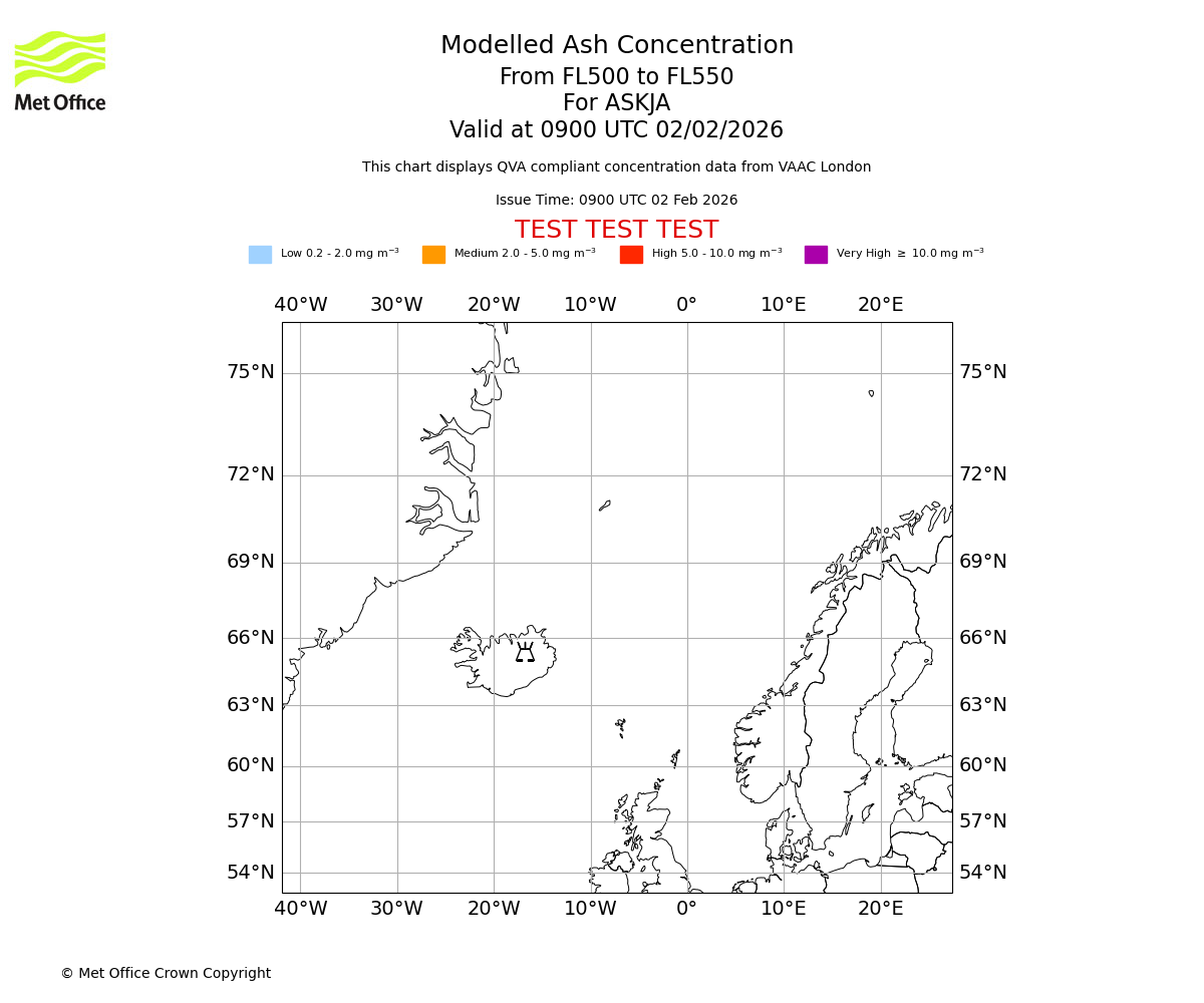 Modelled ash concentration from 450 to 500 for ASKJA. Valid at 0900 UTC 02/02/2026